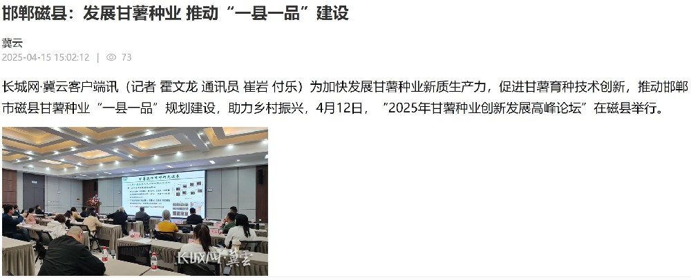 2025年4月15日,邯鄲日報發(fā)布題為《磁縣:甘薯論壇話育種創(chuàng)新》的報道,此次論壇的召開,旨在促進甘薯育種技術(shù)創(chuàng)新,推動磁縣甘薯種業(yè)“一縣一品”規(guī)劃建設(shè),助力鄉(xiāng)村振興。