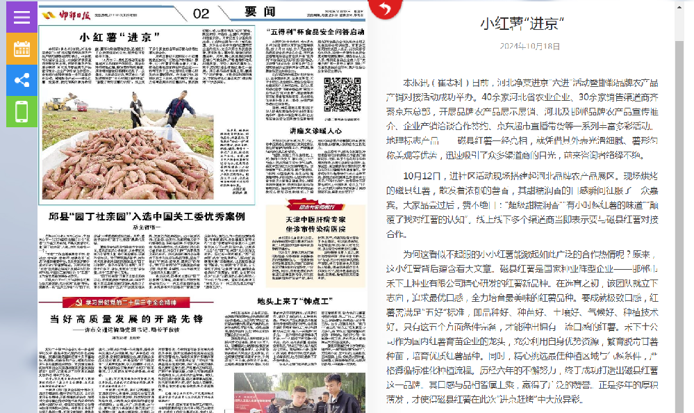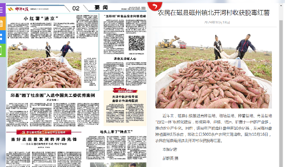 2024年10月16日,邯鄲日報(bào)社打造的平臺級移動客戶端“新邯鄲”,發(fā)布《鄉(xiāng)村振興添動能 小紅薯種出大產(chǎn)業(yè)》報(bào)道。該報(bào)道聚焦磁縣脫毒紅薯產(chǎn)業(yè),解析了磁縣這一地方特色產(chǎn)業(yè)的發(fā)展模式、規(guī)?;ㄔO(shè)及對社會經(jīng)濟(jì)的積極影響。