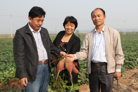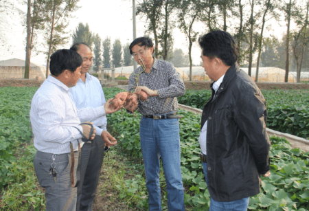 李洪民甘薯專家、天豫顧效志副總經(jīng)理、禾下土總經(jīng)理崔伏喜等在禾下土脫毒甘薯種苗基地留影