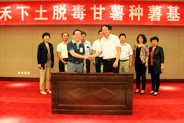 2015年9月24日在"2015年禾下土脫毒甘薯種薯基地觀摩會"召開期間,《邯鄲市禾下土種業(yè)有限公司與中國農(nóng)科院甘薯研究所所企合作框架協(xié)議》簽約儀式在磁縣溢泉湖嵩景樓國際會議中心隆重舉行。邯鄲市禾下土種業(yè)有限公司總經(jīng)理崔伏喜與徐州市農(nóng)科院副院長李強(qiáng)分別代表雙方簽署《所企合作框架協(xié)議》。國家甘薯產(chǎn)業(yè)技術(shù)研發(fā)中心綜合實(shí)驗(yàn)室主任、崗位科學(xué)家李洪民研究員、國家甘薯產(chǎn)業(yè)技術(shù)體系崗位科學(xué)家、河南省農(nóng)科院植保所所長張振臣、國家甘薯產(chǎn)業(yè)技術(shù)體系石家莊綜合試驗(yàn)站站長、崗位科學(xué)家張松樹研究員、河南省商丘市農(nóng)科院副院長楊愛梅研究員出席簽字儀式。