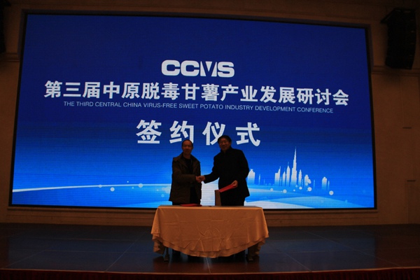 2016年1月6日-7日,第三屆中原脫毒甘薯產(chǎn)業(yè)發(fā)展研討會在河北磁縣溢泉湖度假村隆重舉行。會議期間,邯鄲市禾下土種業(yè)有限公司總經(jīng)理崔伏喜與龍薯9號育種人、國家甘薯現(xiàn)代農(nóng)業(yè)產(chǎn)業(yè)技術(shù)福建龍巖綜合實驗站站長、龍巖市農(nóng)業(yè)科學(xué)研究所首席專家楊立明分別代表雙方簽訂了《甘薯新品種推廣項目合作意向書》。