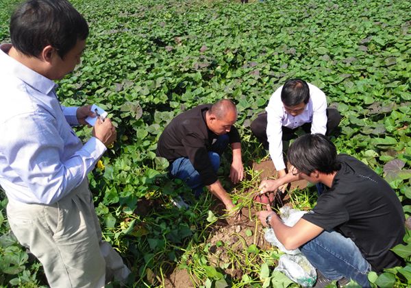 鞏志忠院長一行詳細了解邯鄲市禾下土種業(yè)有限公司在脫毒組培、脫毒種薯生產(chǎn)、脫毒種苗繁育等方面的創(chuàng)新發(fā)展情況,圍繞種薯、種苗、商品薯在生產(chǎn)過程中的主要技術(shù)環(huán)節(jié)進行了深入交流。在禾下土脫毒甘薯種薯田,齊俊生博士對"維大利"植物免疫激活蛋白在甘薯上不同濃度噴施、占根的對照表現(xiàn)進行現(xiàn)場抽檢,詳細記錄各種對照試驗數(shù)據(jù),綜合分析維多利對甘薯產(chǎn)量、品質(zhì)、抗病性、控旺促長等方面研究試驗。