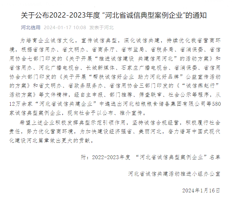 2024年1月16日,河北省誠信共建活動推進小組辦公室公布了2022-2023年度“河北省誠信典型案例企業(yè)”名單,邯鄲市禾下土種業(yè)有限公司等580家誠信企業(yè)入選。