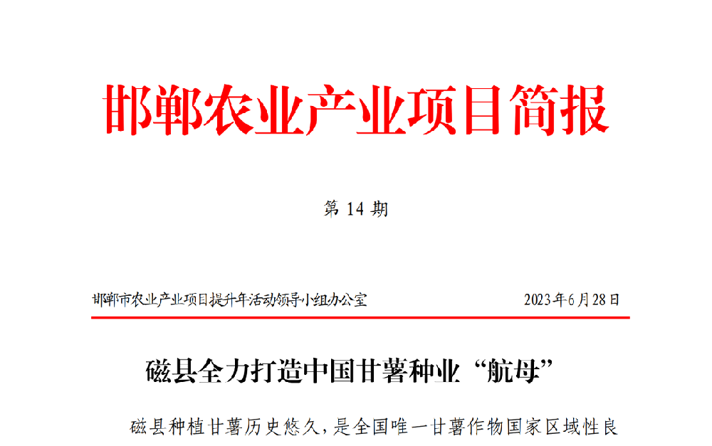 2023年6月28日,邯鄲市農(nóng)業(yè)產(chǎn)業(yè)項(xiàng)目提升年活動領(lǐng)導(dǎo)小組辦公室發(fā)布第14期《邯鄲農(nóng)業(yè)產(chǎn)業(yè)項(xiàng)目簡報》磁縣全力打造中國甘薯種業(yè)“航母”。