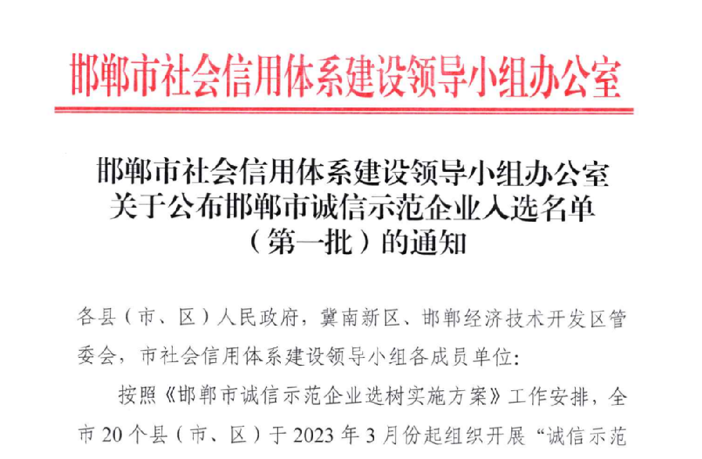 2023年6月26日,邯鄲市社會信用體系建設(shè)領(lǐng)導(dǎo)小組辦公室公布“邯鄲市誠信示范企業(yè)入選名單(第一批)”,邯鄲市禾下土種業(yè)有限公司等348家企業(yè)入選邯鄲市“誠信示范企業(yè)”。