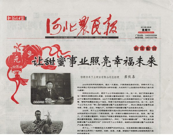 2016年的新年鐘聲即將敲響,值此一元復(fù)始、萬(wàn)象更新的美好時(shí)刻,邯鄲市禾下土種業(yè)有限公司向大家致以新年的祝福!向支持禾下土發(fā)展的朋友們表示衷心的感謝!剛剛過(guò)去的2015年,是禾下土快速發(fā)展的一年。這一年,我們憑借執(zhí)著的專(zhuān)注精神和深厚的團(tuán)隊(duì)底蘊(yùn),在脫毒甘薯領(lǐng)域?qū)崿F(xiàn)了一個(gè)又一個(gè)的突破與發(fā)展。我們完成了26個(gè)甘薯品種的脫毒組培,300萬(wàn)斤脫毒原種薯和1.2億株脫毒種苗的工廠化繁育與銷(xiāo)售,營(yíng)銷(xiāo)網(wǎng)絡(luò)覆蓋全國(guó)24個(gè)省區(qū),取得經(jīng)濟(jì)效益和社會(huì)效益雙豐收。這一年,由禾下土主辦的"第二屆中原脫毒甘薯產(chǎn)業(yè)發(fā)展研討會(huì)",再次匯聚了國(guó)內(nèi)甘薯界權(quán)威專(zhuān)家、學(xué)者、企業(yè)、種植大戶(hù),共同探討中國(guó)脫毒甘薯產(chǎn)業(yè)的發(fā)展與未來(lái)。2016年,禾下土將繼續(xù)加強(qiáng)與國(guó)內(nèi)頂尖科研機(jī)構(gòu)的深層次戰(zhàn)略合作,使企業(yè)科技研發(fā)水平達(dá)到一個(gè)新的高度。進(jìn)...