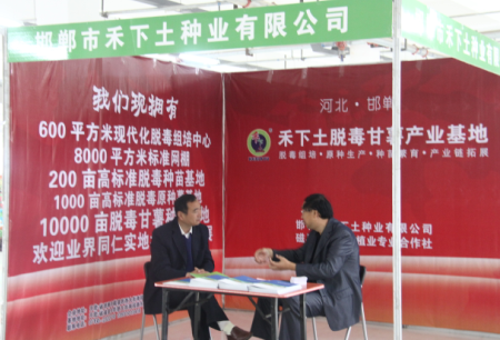 2014年10月19日山東省聊城農(nóng)產(chǎn)品產(chǎn)銷對(duì)接會(huì)暨第二屆水城金秋綠色食品博覽會(huì)在聊城農(nóng)產(chǎn)品物流交易中心隆重開(kāi)幕,博覽會(huì)以優(yōu)質(zhì)農(nóng)產(chǎn)品展銷、對(duì)接為核心,展覽面積20000平方米,邀請(qǐng)全國(guó)約450個(gè)優(yōu)質(zhì)農(nóng)產(chǎn)品生產(chǎn)、加工、規(guī)?;纭⒂N等企業(yè)參展。邯鄲市禾下土種業(yè)有限公司作為國(guó)內(nèi)領(lǐng)先的脫毒甘薯種苗、種薯生產(chǎn)企業(yè)應(yīng)邀出席、參展?! ?博覽會(huì)上,邯鄲市禾下土種業(yè)有限公司總經(jīng)理崔伏喜為與會(huì)企業(yè)介紹了禾下土脫毒甘薯產(chǎn)業(yè)基地的建設(shè)發(fā)展情況,并與全國(guó)各地20余家甘薯(紅薯)育苗、生產(chǎn)、加工企業(yè)進(jìn)行了產(chǎn)業(yè)對(duì)接,有效推動(dòng)了脫毒甘薯產(chǎn)業(yè)的快速發(fā)展。與客戶業(yè)務(wù)洽談山東省聊城農(nóng)產(chǎn)品產(chǎn)銷對(duì)接會(huì)暨第二屆水城金秋綠色食品博覽會(huì)延伸閱讀: 邯鄲市禾下土種業(yè)有限公司成立于2002年1月,是一家集農(nóng)業(yè)科研、育種、試驗(yàn)示范、新...